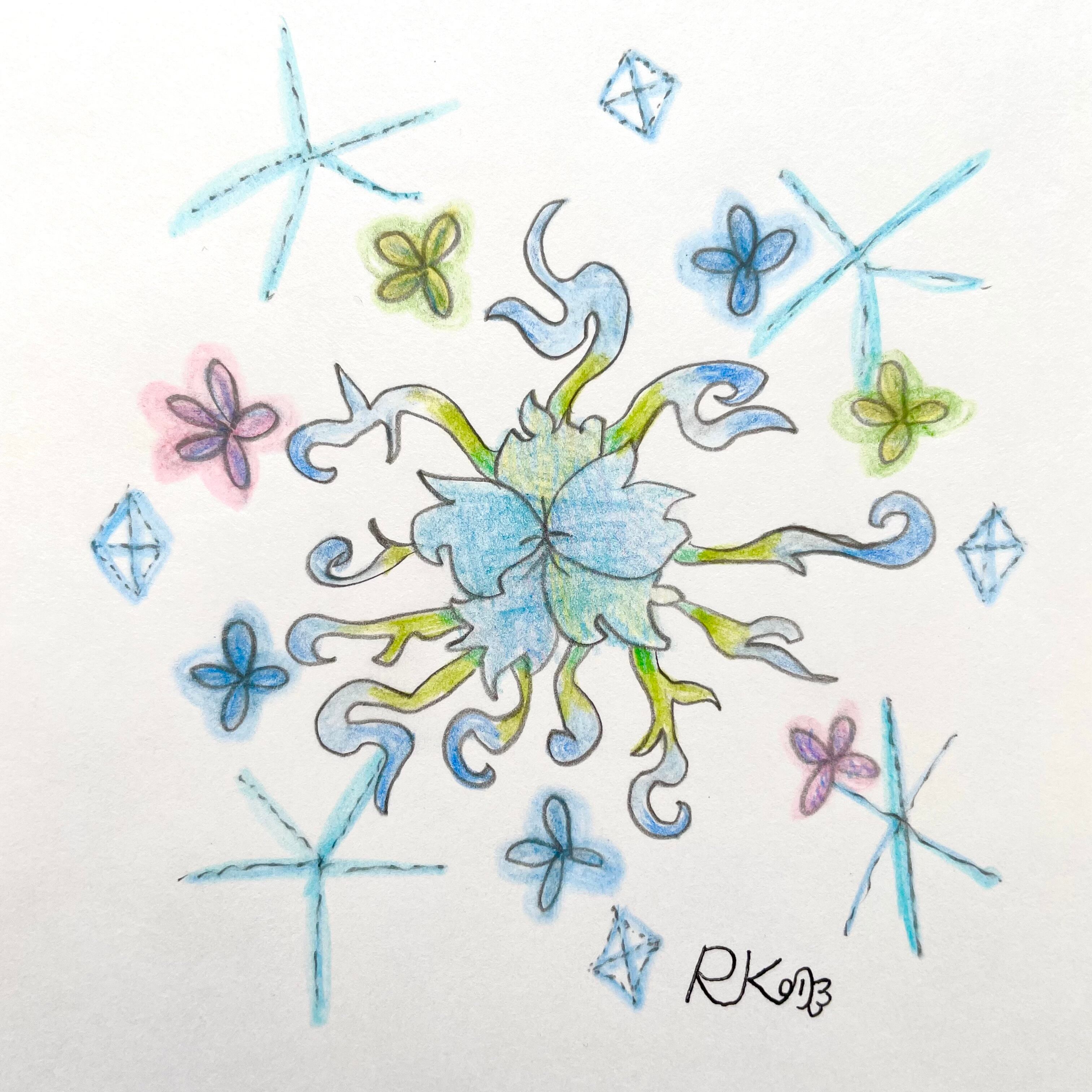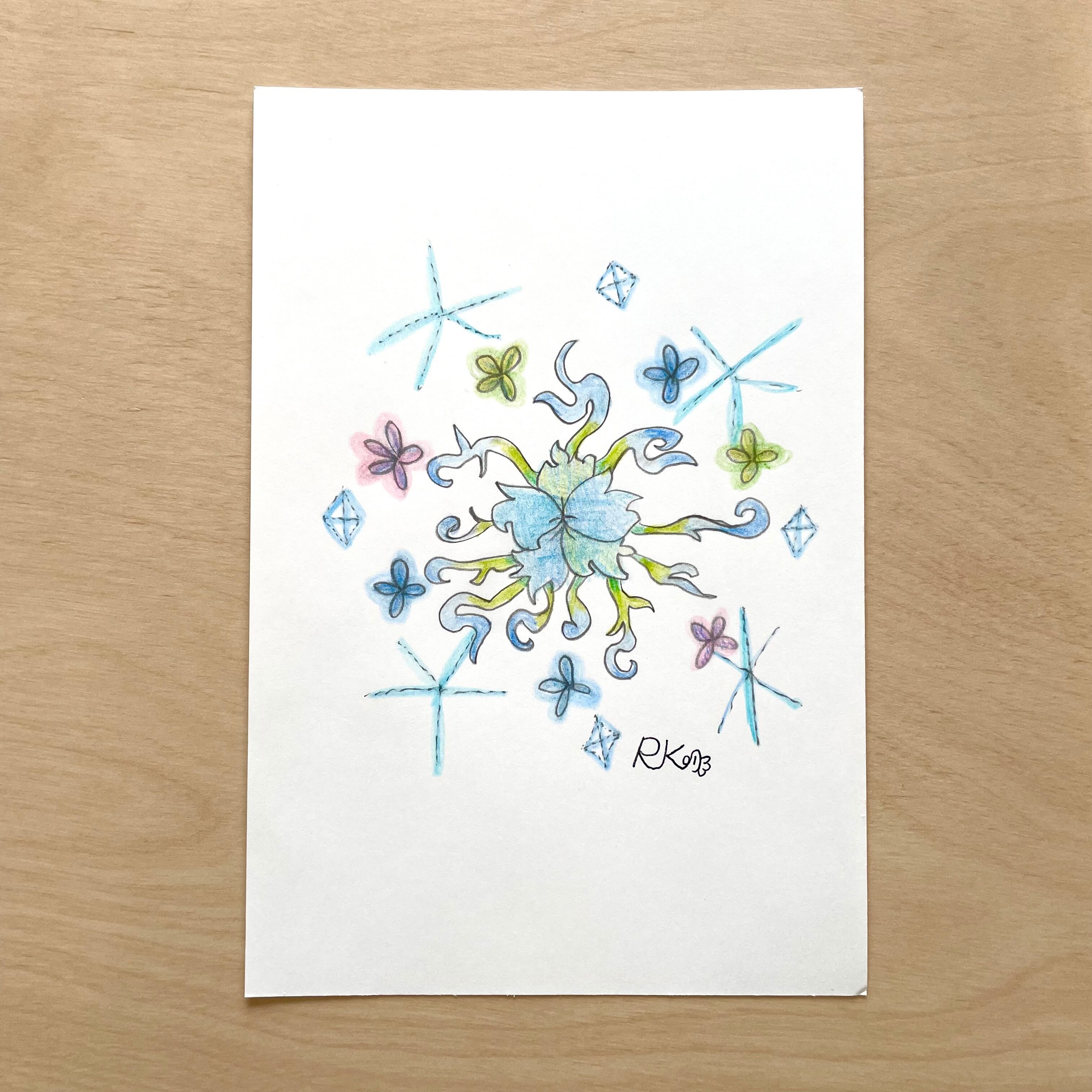 見た目は凍ったように美しいフローズンフラワー。色鉛筆で一つ一つ丁寧に描き上げました。花びらの透明感や氷のような輝きが、まるで冬の魔法のようです。